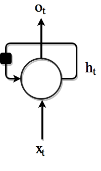 شکل ۱. سمت چپ . دیاگرام مدار . مربع سیاه رنگ نمایانگر تاخیر زمانی یک گام زمانی است. سمت راست:‌همان شبکه که بصورت یک گراف محاسباتی باز شده نمایش داده شده است. هر نود مرتبط با یک زمان خاص است. (اشاره به یک گام زمانی دارد)