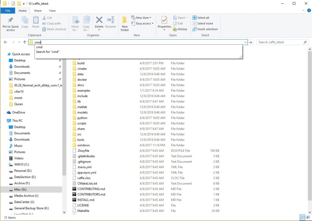 حالا برگردید به روت کفی . یعنی وارد پوشه کفی بشید بطوریکه پوشه های دیگه رو بتونید بببنید . مثل examples, scripts,python, و …. وقتی وارد پوشه شدید بدون اینکه روی هیچ فولدری کلیک کنید Shift رو نگهدارید و راست کلیک کنید. تو پنجره راست کلیک شما یه گزینه باید باشه بنام open command windows here روش کلیک کنید. پنجره cmd اجرا میشه و میبینید که مسیرش داخل کفی هست. (البته راه ساده تری هم هست اونم اینه که برای اینکه cmd رو تو یه پوشه خاصی باز کنیم وارد اون پوشه مورد نظر میشیم حالا تو آدرس باری که بالا پوشه هست و مسیر پوشه ما رو نشون میده کلیک میکنیم .هرچی هست پاک میکنیم مینویسیم cmd و انتر میکنیم . cmd تو پوشه ما اجرا میشه و مسیرش میشه مسیر جاری ما. )