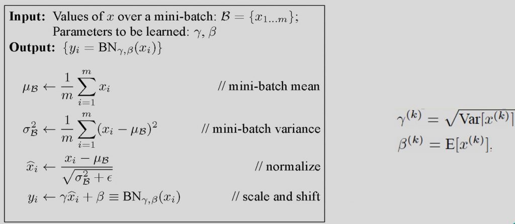 اینجاست که پارامترهای گاما و بتا معرفی میشن و مثل بقیه پارامترها یادگرفته میشن . اگر مقدار گاما برابر با sqrt(var(x)) و بتا هم برابر میانگین باشه ما اکتیویشن های اصلی رو بدست میاریم یا بعبارت دیگه تغییری در توزیع نمیدیم انگار که نرمالسازی انجام نشده .