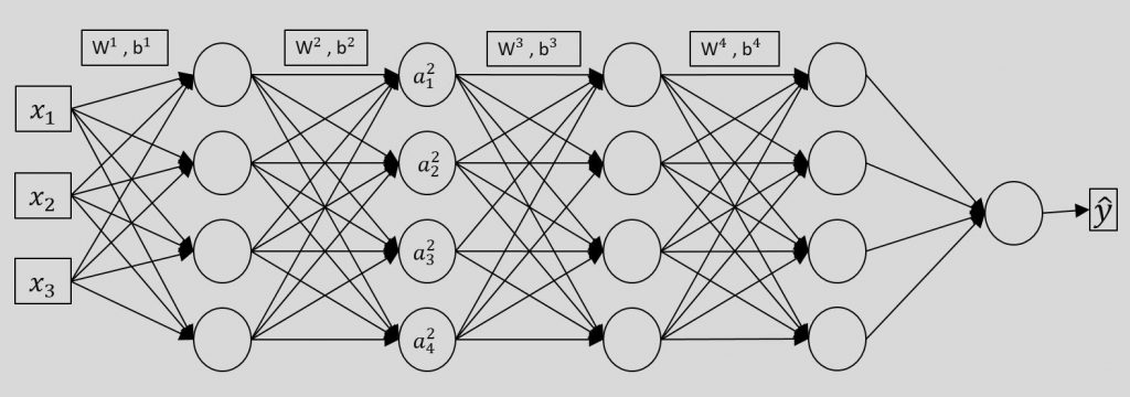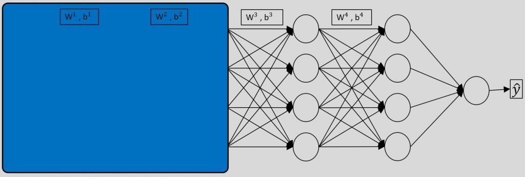 در تصویر بالا فرض کنید ما بخواییم پارامترهای W3 , b3 رو تنظیم کنیم . لایه سوم ما یکسری ورودی داره که ما بهش میگیم a1 الی a4 . اگه بخواییم از دید لایه سوم به شبکه نگاه کنیم بصورت زیر خواهد بود :